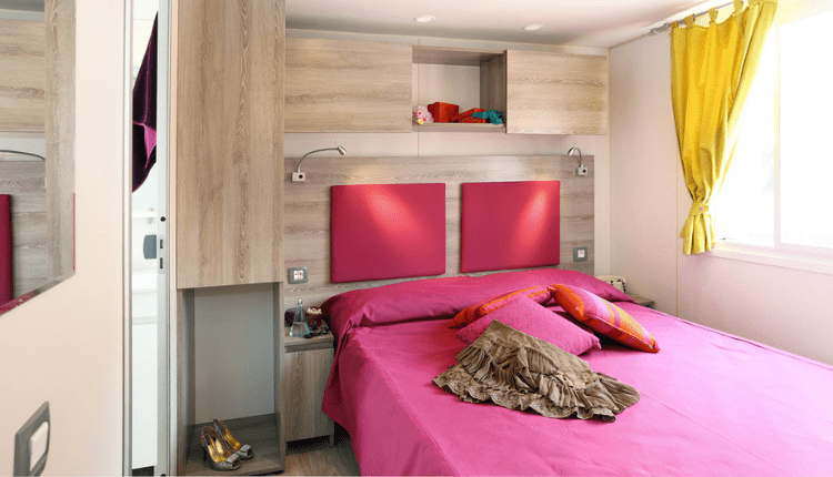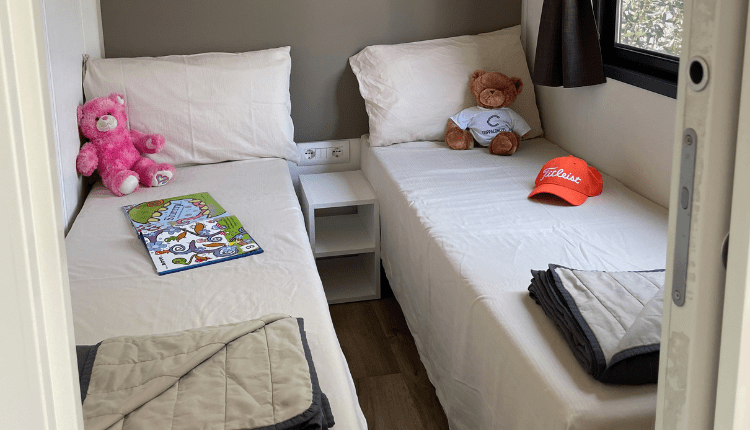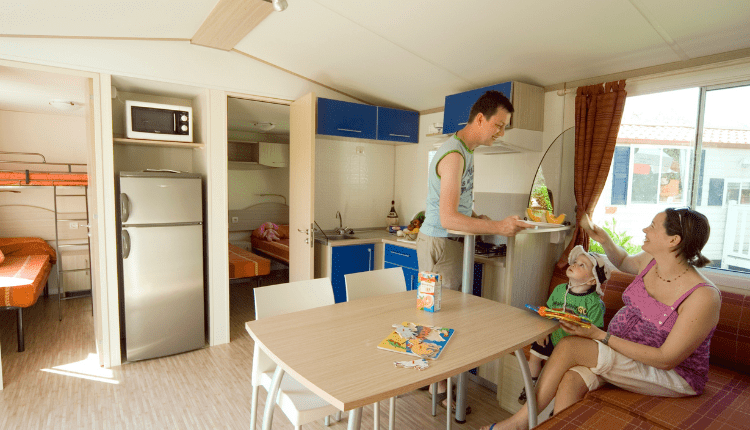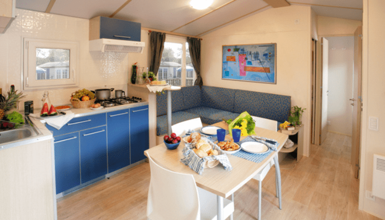 Spacious 3-bedroom mobile home (4.0 x 8.30 m) for up to 7 people. Perfect for larger families or couples travelling together. The open-plan living room and kitchen are modern and equipped with a 4-burner gas hob, microwave, tall fridge with freezer compartment, coffee machine and kettle. Everything is neatly stored in the many kitchen cupboards.