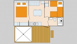 The Sunset Deluxe has been a family favourite at Marina di Venezia campsite for many years. This spacious mobile home sleeps 6 and has 2 bedrooms, plenty of storage space, a fully equipped kitchen with large fridge (incl. freezer compartment) and a 4-burner gas hob.