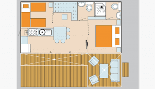 The mobile home has air conditioning and a large wooden terrace with luxury lounge set and canopy for maximum outdoor comfort.