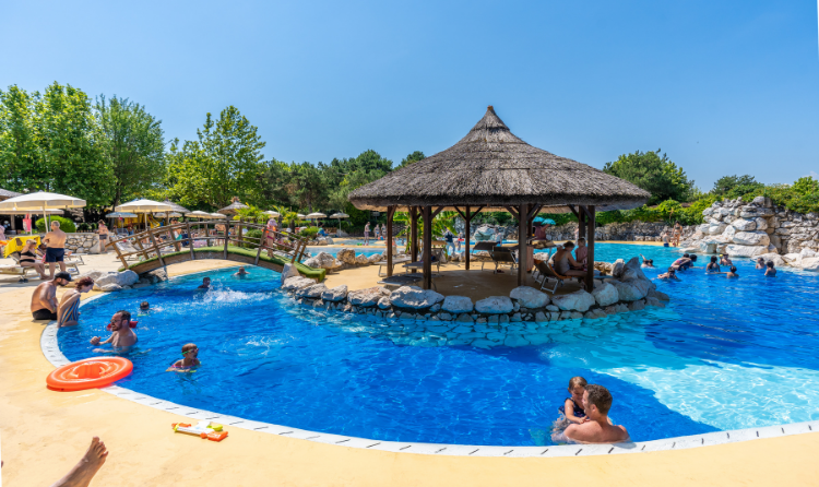 Camping Tahiti on the Adriatic coast is an ideal family campsite, surrounded by greenery and with three unique swimming pools: an Olympic pool, an exotic pool with palm trees and Jacuzzis, and a child-friendly lagoon with rocks and waterfalls. It is a true swimming paradise for young and old. There is also plenty of entertainment outside the water, such as mini golf and an adventure climbing course.