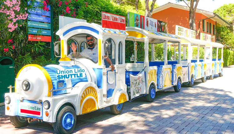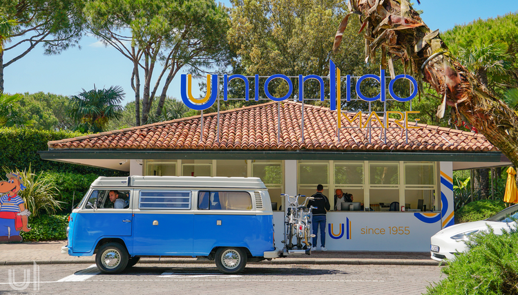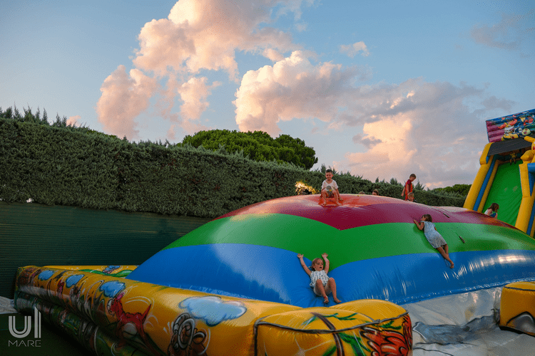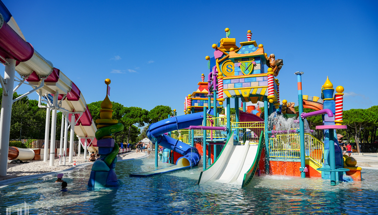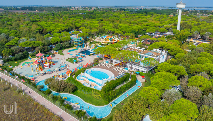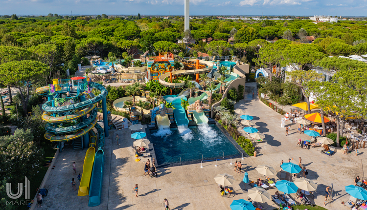Union Lido Mare has been Italy's luxury campsite for years, with top facilities and two large water parks: Aqua Park Laguna and Speedy Island. Aqua Park Laguna is unique with white sand, palm trees, waterslides, a wave pool, and a spray park. Speedy Island is an innovative water park with a 10-meter-high slide, a lazy river through a themed village, a play castle, a spray park, and speedy falls.