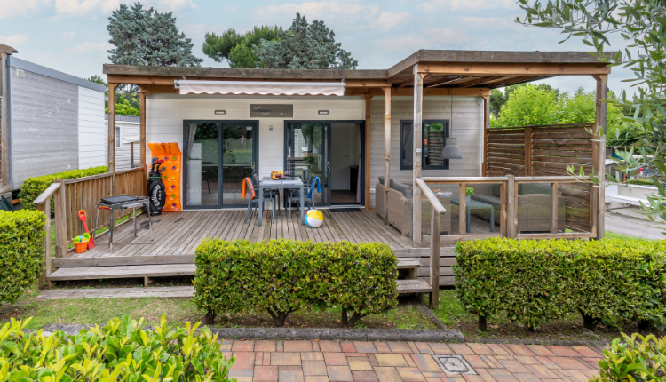 The mobile home has air conditioning and a large wooden terrace with luxury lounge set and canopy for maximum outdoor comfort.