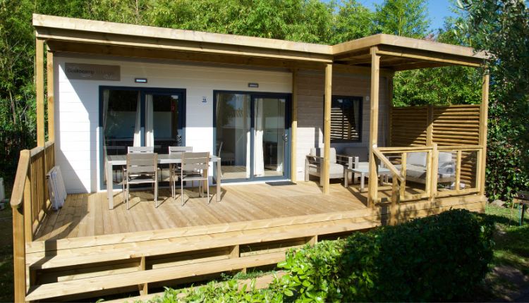 The mobile home has air conditioning and a large wooden terrace with luxury lounge set and canopy for maximum outdoor comfort.