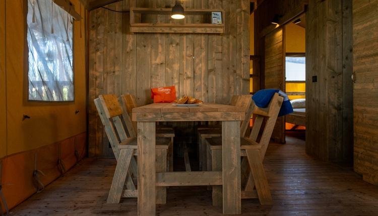 With a spacious living room, the Safari Tent Gusto Premium has a table and chairs and a separate seating area. The tent doors at the front can be rolled, opening the entire Lodge out onto the terrace area.