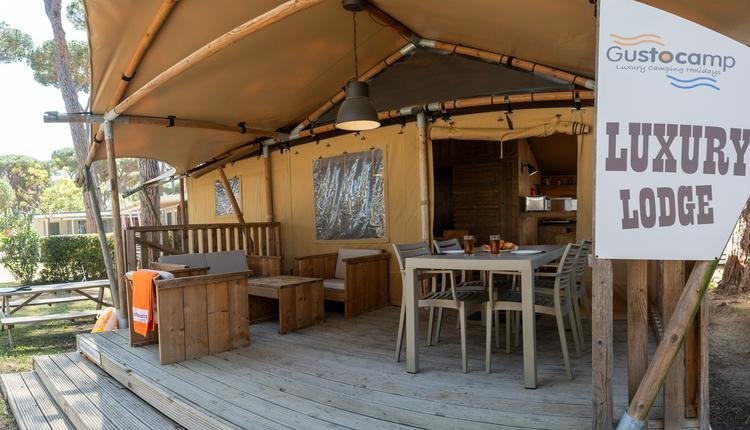 [omschrijving_content] => With a spacious living room, the Safari Tent Gusto Premium has a table and chairs and a separate seating area. The tent doors at the front can be rolled, opening the entire Lodge out onto the terrace area.