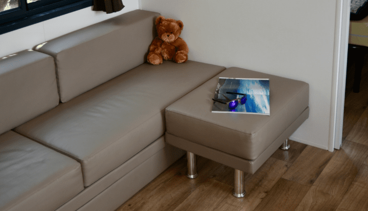 Living/Dining area with pull out sofa bed and Air Conditioning.