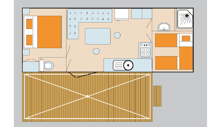 Our 2 bedroom mobilehome has a spacious living/dining area with double doors opening onto the terrace outside. There is a double bedroom and a second bedroom with 2 single beds plus a third single "pull-down" bed (max. 40 kg). This mobile home has a shower room and a toilet*. There is a well equipped kitchen area with large American style fridge-freezer, gas hob and everything else you need for a enjoyable holiday, including air conditioning.