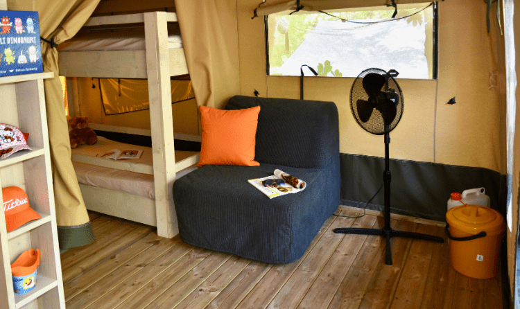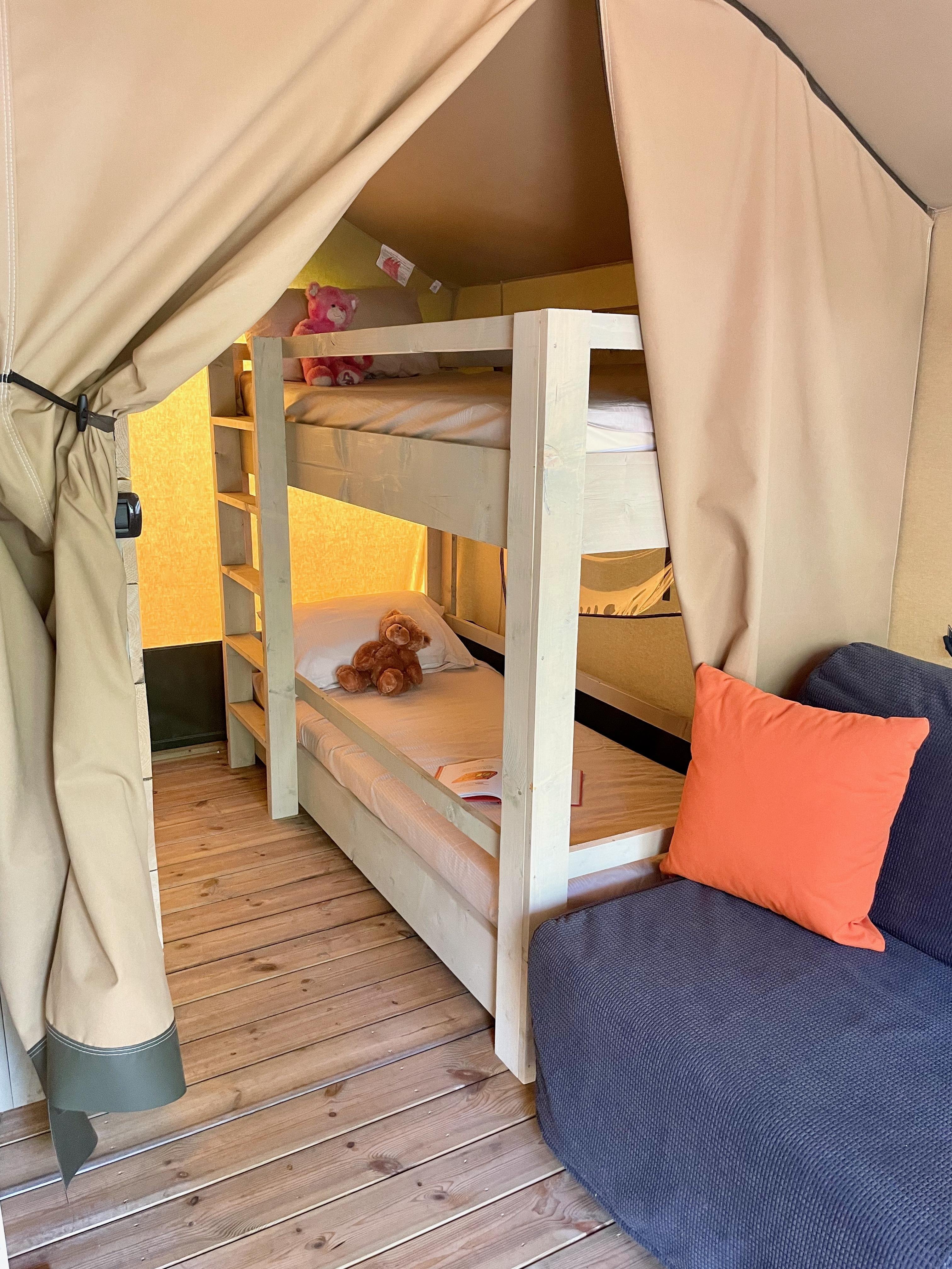 Bedrooms: The safari tent has high bedrooms with comfortable beds with good mattresses. There is no lack of wardrobe space and duvets and pillows are also provided. The 1st bedroom of the safari tent has a double bed, the 2nd bedroom has a bunk bed. The living room has a sofa which can be converted into a comfortable single bed.