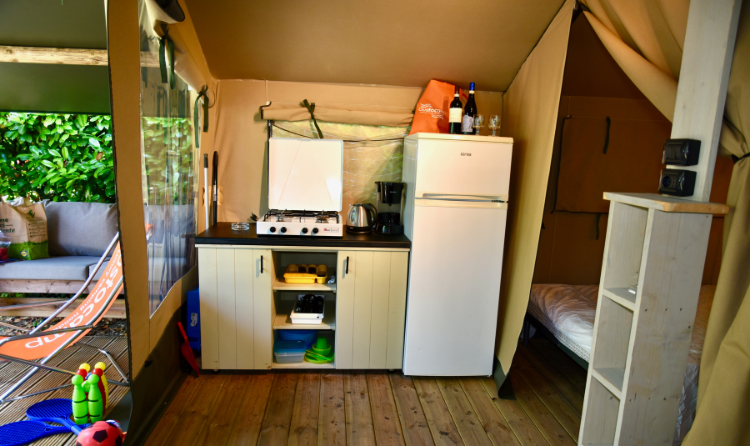 Living area: In the living area of the safari tent Gusto, you have access to a complete kitchen with lockable cupboards for your food, a 4-burner gas cooker and a tall fridge with a freezer compartment. The tent's kitchen inventory even includes a coffee machine, so you can enjoy your cup of coffee on the veranda.