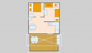 Fully equipped living-kitchen-dining area opens to the outdoors and comes with gas hob, fridge and a handy kitchen table. The kitchen has cupboards, ideal to store all of your holiday snacks and treats!